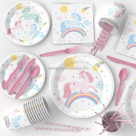 Vendita calda di unicorno modello arcobaleno Set stoviglie usa e getta piatti di carta rosa tovaglioli posate per ragazze festa di compleanno