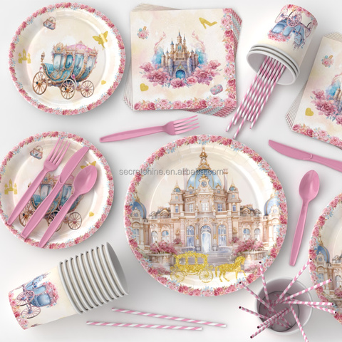 Carrozza castello Set stoviglie monouso cartone animato vendita calda piatti di carta tazze per feste di compleanno ragazze decorazioni per tavola