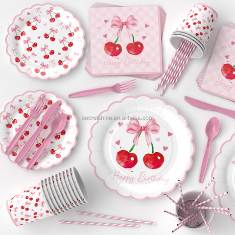 Il Set di stoviglie usa e getta per ragazze con nastro di ciliegio per feste di compleanno include tovaglia con rifiniture in pizzo